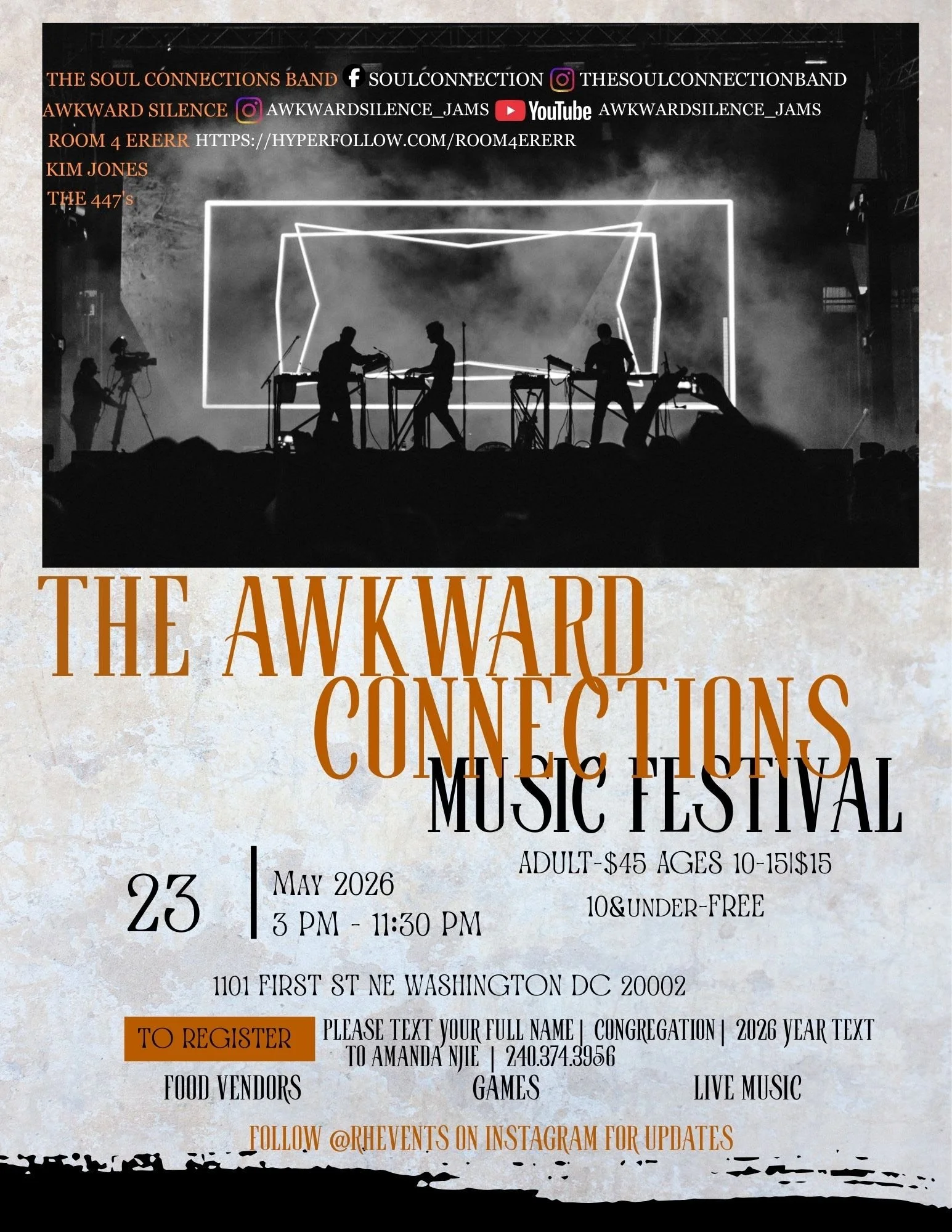 Sister Amanda Njie (Russett Congregation in Laurel, Maryland) says, “I am organizing a music festival on May 23. This all-ages, all-Witness event brings together live bands, a DJ, games, food vendors, face-painting, and chill cabañas for the ultimate hangout. Come make memories, meet new friends, and soak-up the energy at the Awkward Connections Music Festival.”