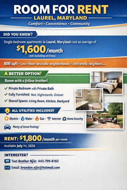 For rent (brothers): 2 rooms in Laurel, MD houseBrother Brandon Njie (Russett Congregation in Laurel, Maryland) shares: Posted on April 6, 2026 by Tomcast.